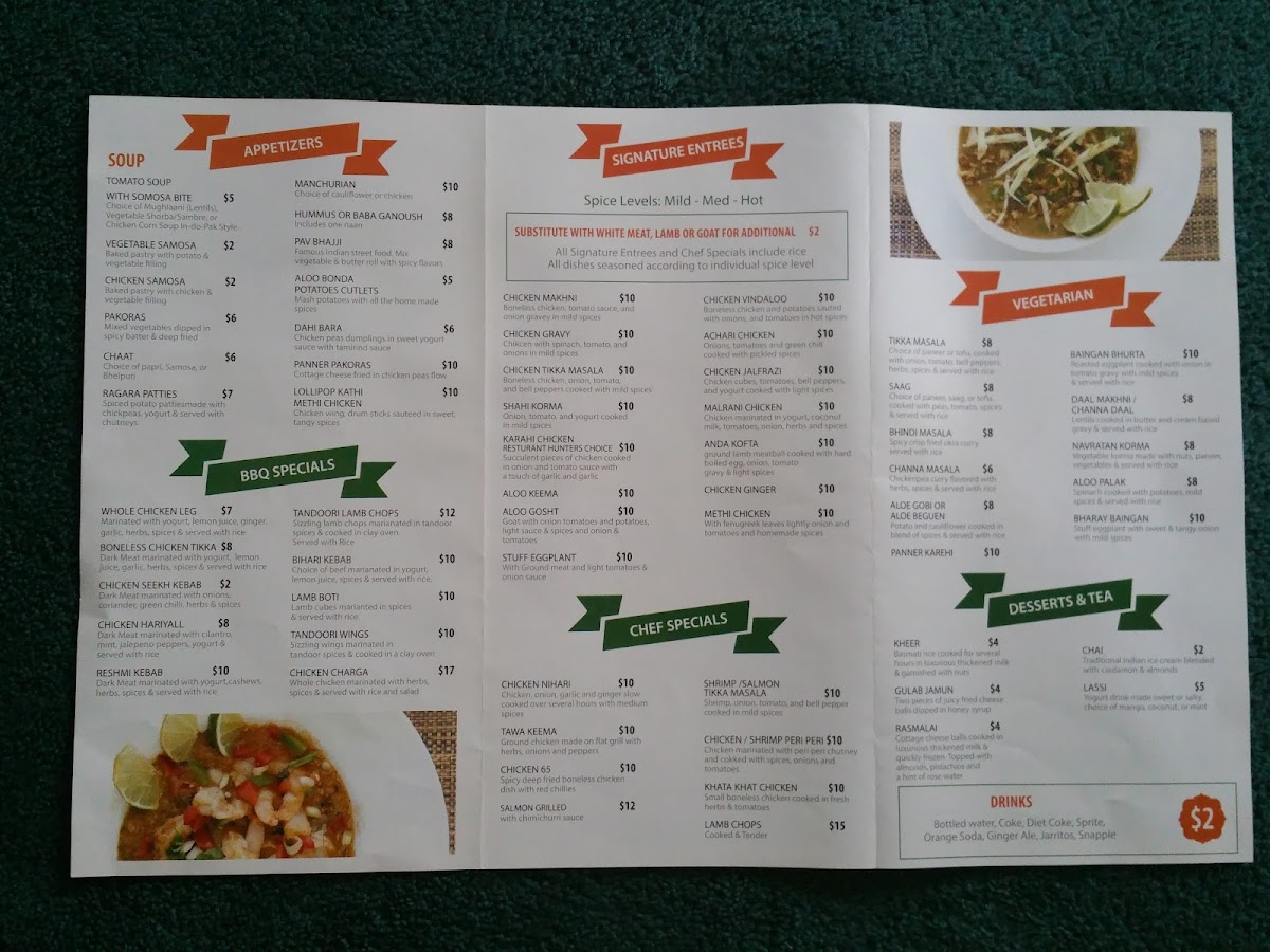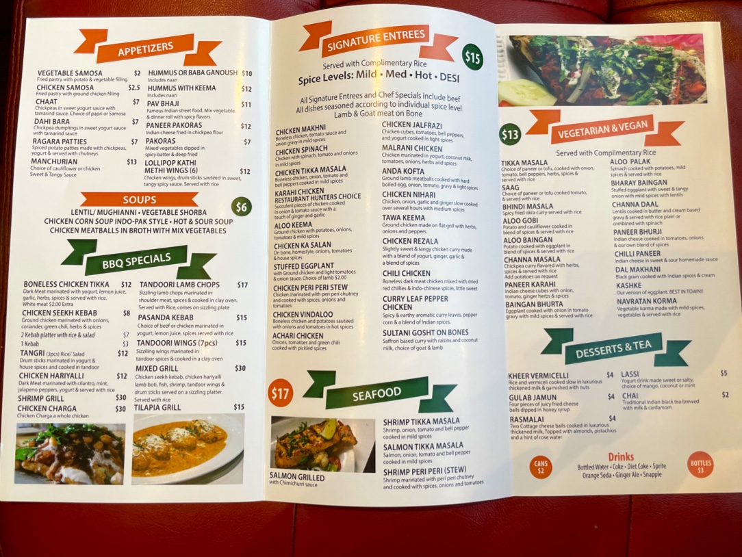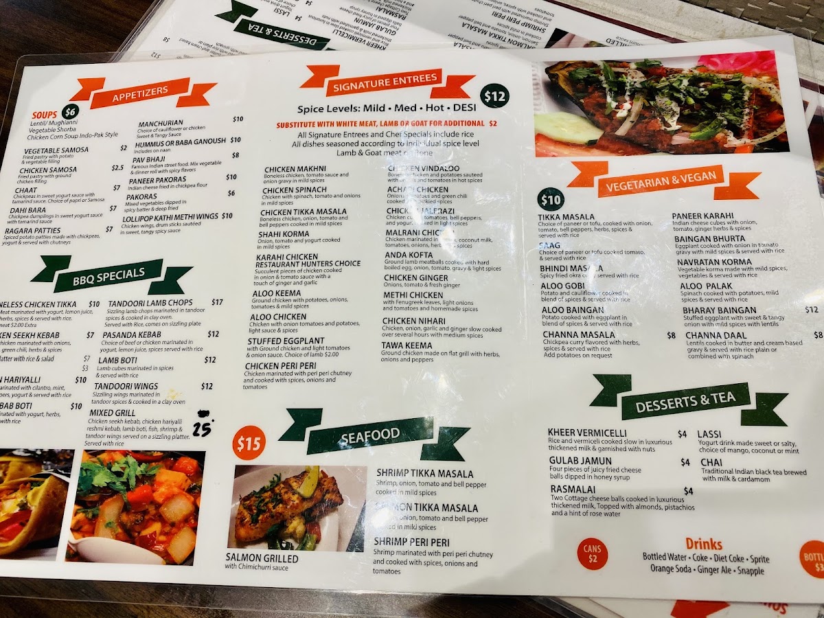 The Signature Entrées offer rich, savory options such as the crowd-favorite Chicken Tikka Masala, Chicken Makhni, and the spicy Chicken Vindaloo. For a more hearty option, the Karahi Chicken and Malrani Chicken showcase complex flavors that are sure to satisfy.