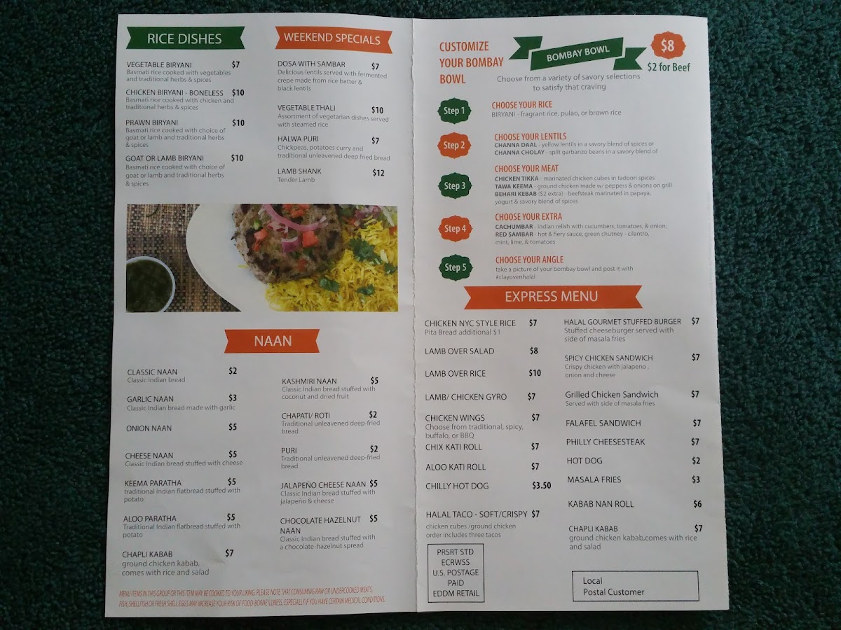 For a quick bite, the Express Menu features items like Chicken NYC Style Rice, Masala Fries, and Lamb Over Rice, as well as Kebab Naan Roll and Halal Taco.